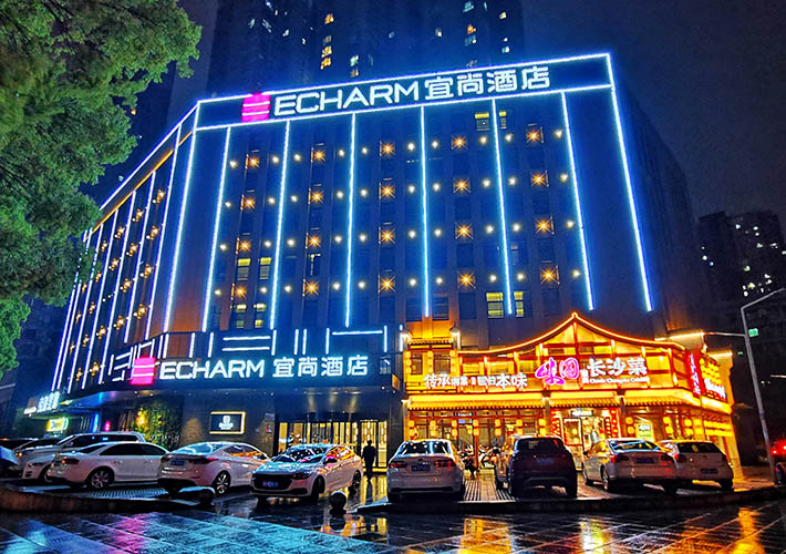 長沙酒店亮化 戶外亮化設(shè)計(jì) LED夜景亮化安裝及施工工程采用IP 65防護(hù)等級(jí)的LED線條燈,十字星光燈搭配設(shè)計(jì)。燈具色溫采用冷、暖色搭配設(shè)計(jì),主線條燈勾勒出建筑亮化的輪廓,采用暖色星光燈營造長沙酒店亮化的溫馨氛圍。